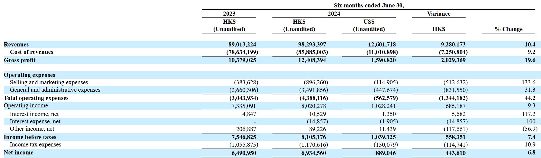 但进入2024年上半年,施莱云端的收入为9829.34万港元,同比增长10.4%,期内净利润为693.46万港元,同比增长6.8%。无论是收入亦或是净利润,增长速度明显放缓。