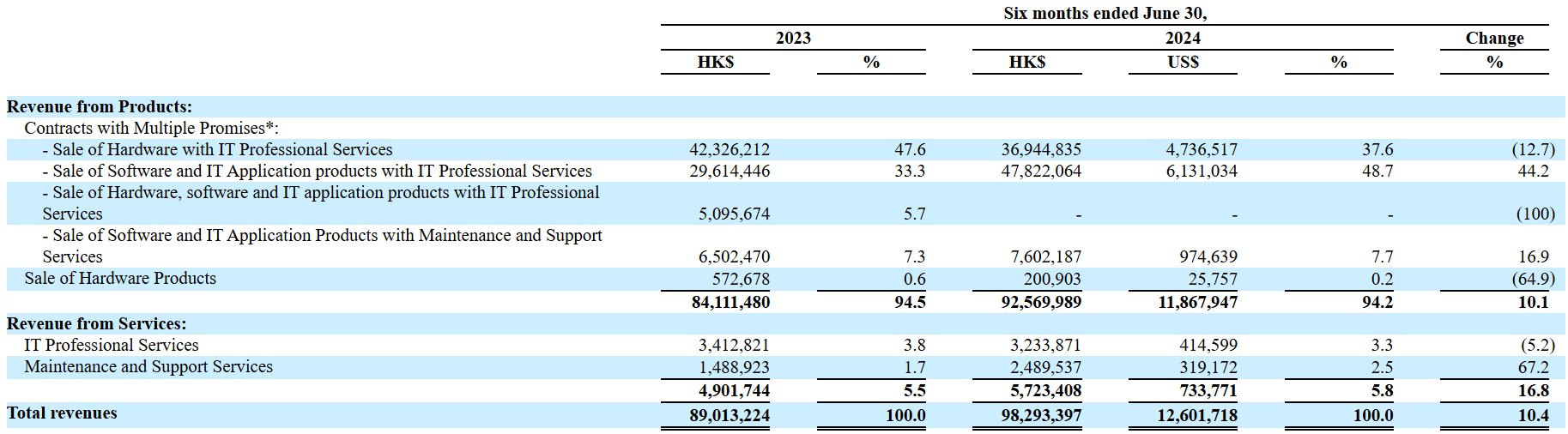 进入2024年上半年,虽然IT专业服务的软件及应用产品收入继续大增44.2%,保持了高速成长,但由于IT专业服务的硬件产品销售收入下滑近12.7%,这拖累公司整体产品销售收入仅增长10.1%,即使服务收入增长16.8%,但由于该业务占比相对较低,因此报告期内公司总收入仅增长了10.4%。